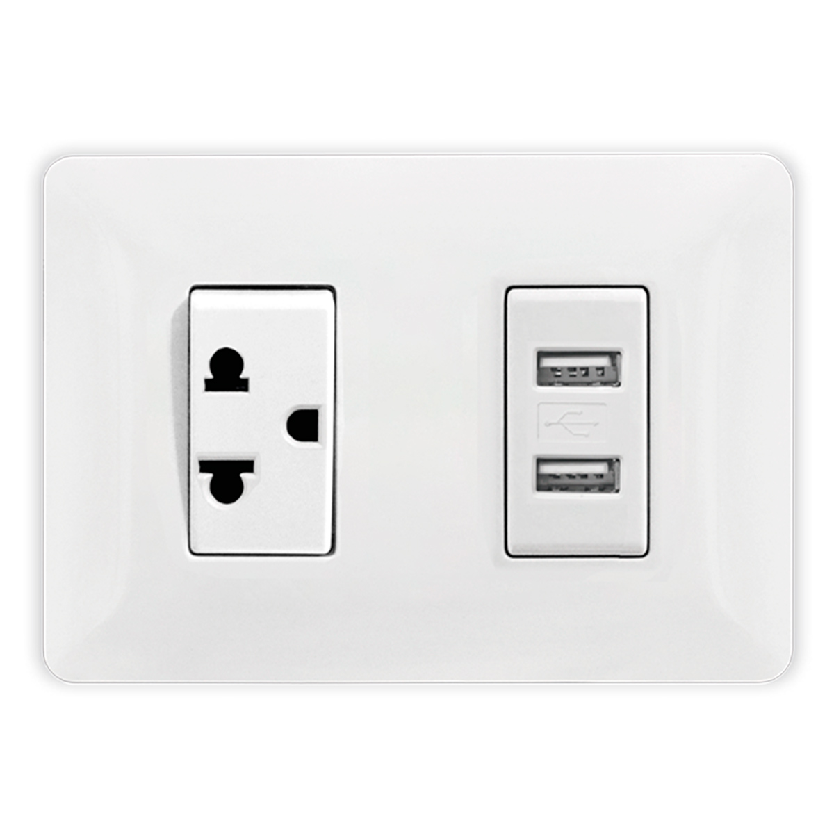 Tomacorriente con tierra más doble puerto USB de la línea Abatron Deluxe, diseñado para brindar una solución práctica y moderna en instalaciones eléctricas. Permite conectar equipos eléctricos convencionales y, al mismo tiempo, cargar dispositivos móviles directamente mediante sus puertos USB.